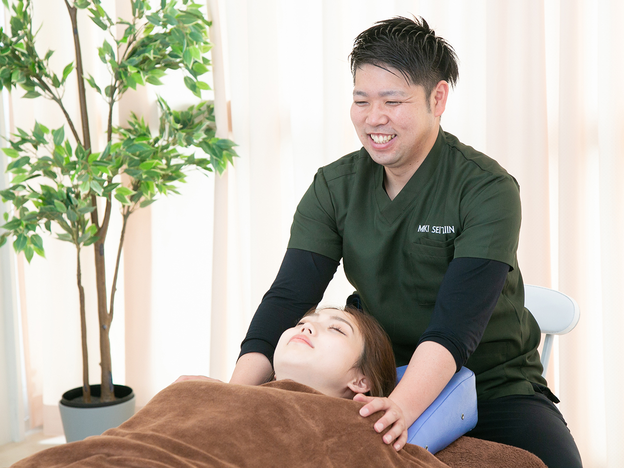 日常生活で、歪んでしまった骨盤に対し て、両足立ちや、スクワットホームなど の動作を細かく分析をしていき、今現状 の骨盤の状態をわかりやすくお伝えしま す。また、根本治療を目的に施術させて いただくので、整体以外にも機能してい ない筋肉に対して収縮(軽度の筋トレ) を入れていき、骨格のバランスを整えて いきます。皆さんも歪みのない体を目指 しましょう。